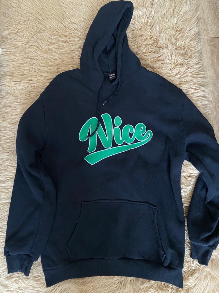 Bu koyu mavi kapüşonlu sweatshirt, bol kesim, bisiklet yaka ve uzun kolludur. Örgü dokusu ve yeşil 'Nice' baskısı vardır, günlük kullanıma uygundur.