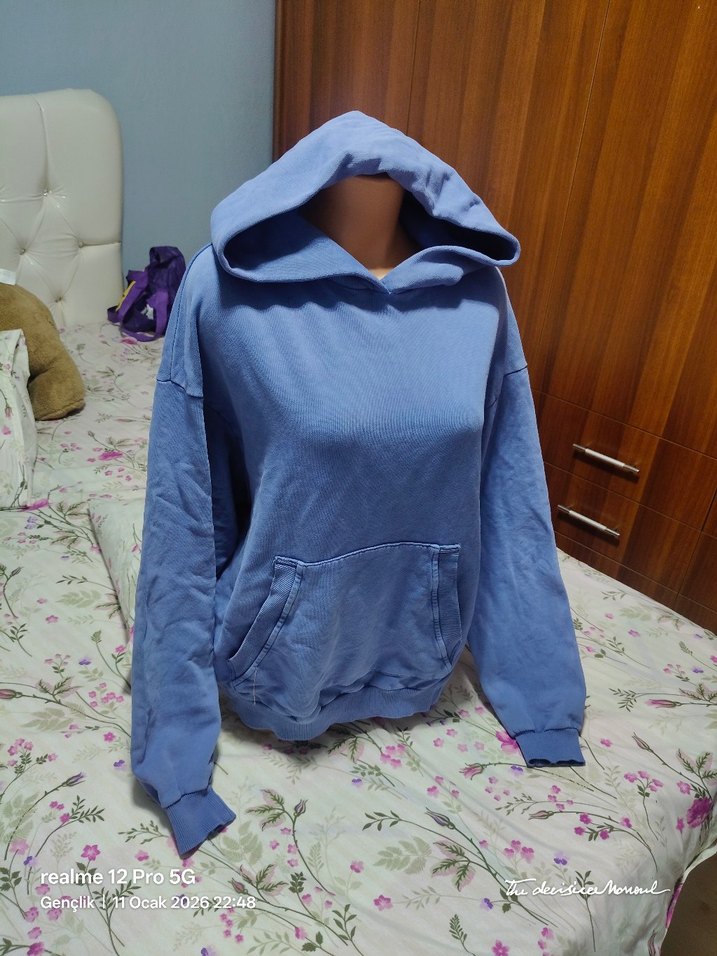 Uzun kollu, kapüşonlu ve yuvarlak yakalı mavi sweatshirt. Yumuşak ve sıcak kumaştan, rahat ve şık bir günlük kullanım için uygundur. Pastel tonuyla trend bir görünüm sunar. En:60Boy:62cm dir