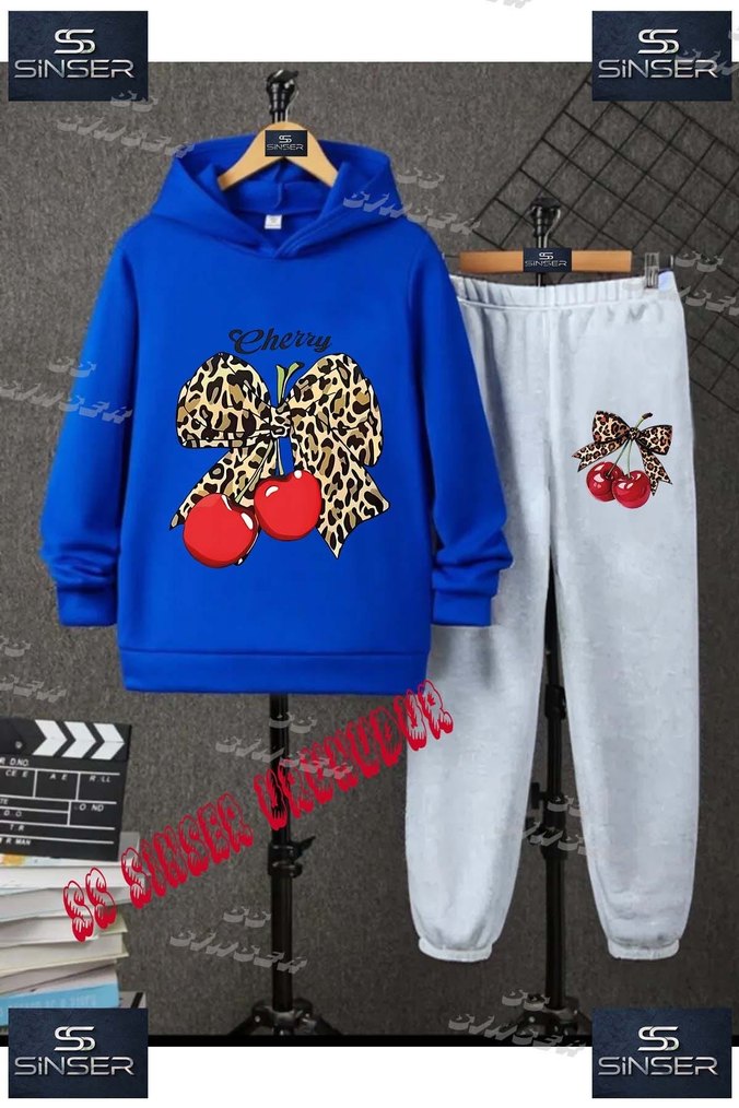 Mavi ve gri renklerde, bol kesim ve sokak stili, pul işlemeli kiraz ve leopar desenli erkek çocuk eşofman takımı. Yumuşak kumaştan üretilmiştir.