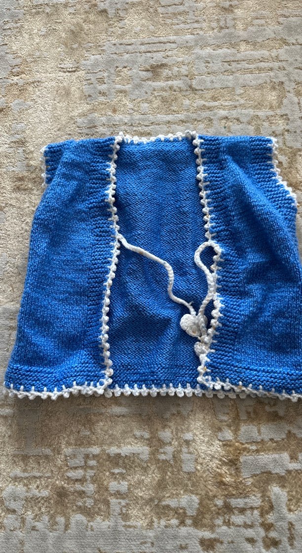 Mavi renkli kız çocukları için kapüşonlu, örgü dokulu, kolsuz ve fitted kesim panço. Gri süslemelerle bohem tarzını yansıtıyor. 1 yaş