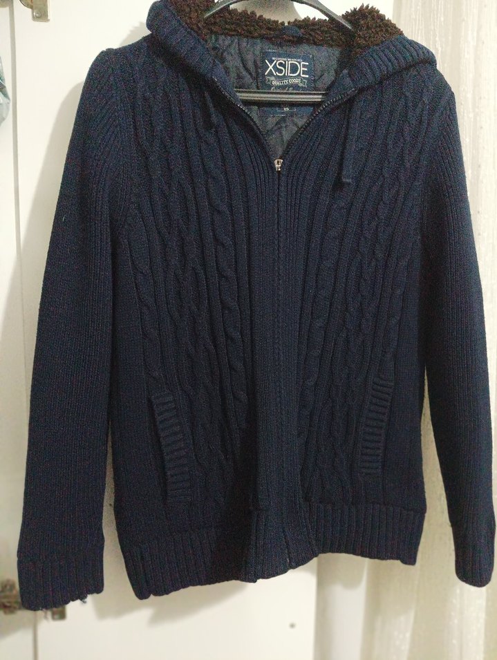 XSIDE marka koyu mavi, örgü yün, kapüşonlu, fermuarlı, fitted uzun kollu kazak. Rahat ve normcore tarzda, günlük kullanıma uygun.