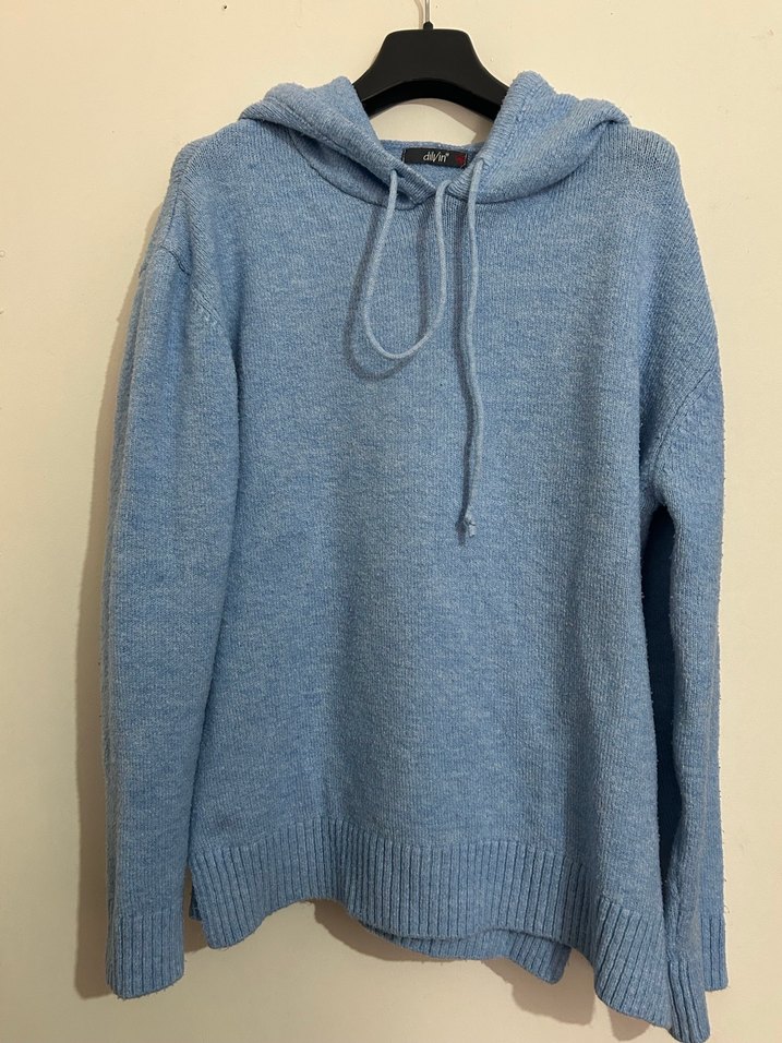 Örgü kumaştan, uzun kollu ve kapüşonlu mavi-gri kadın sweatshirtü, rahat kesimi ve sade tasarımıyla günlük kullanıma uygundur.