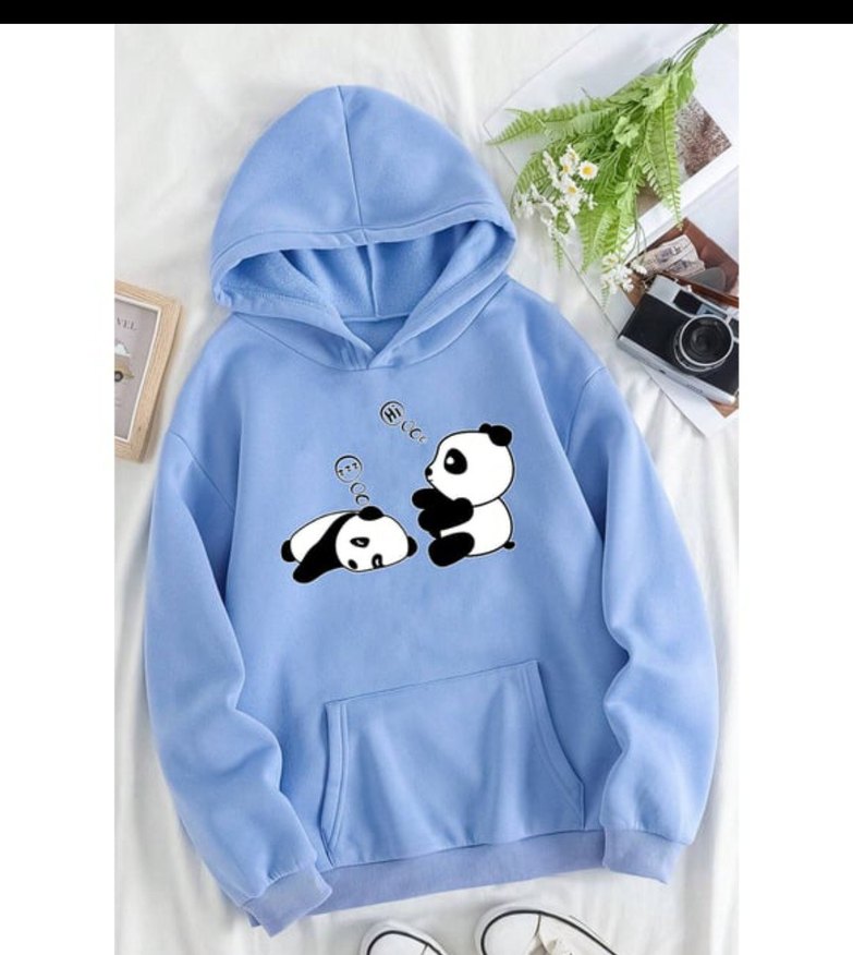 Pofuduk detaylı, uzun kollu, kapüşonlu ve pastel mavi renkli sweatshirt. Ön kısmında sevimli panda baskısı ve cep bulunur. Rahat ve konforlu bir günlük kıyafet.
