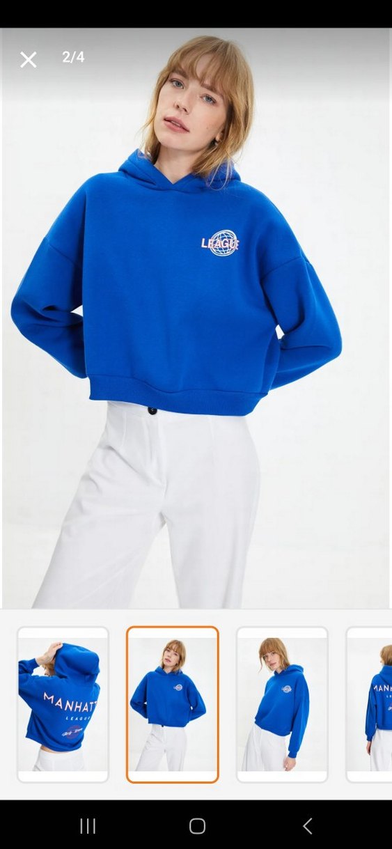 Rahat kesim, bisiklet yaka ve uzun kollu kadın sweatshirtü, yumuşak ve sıcak kumaştan üretilmiştir. Açık mavi renkli ve baskılı desene sahiptir. hiç giyilmedi yeni.