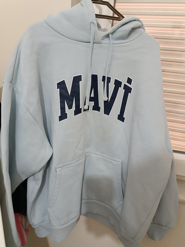 Mavi kapüşonlu sweatshirt, bol kesim ve uzun kollu, yumuşak ve sıcak kumaştan üretilmiştir. Önünde "MAVI" baskısı vardır.