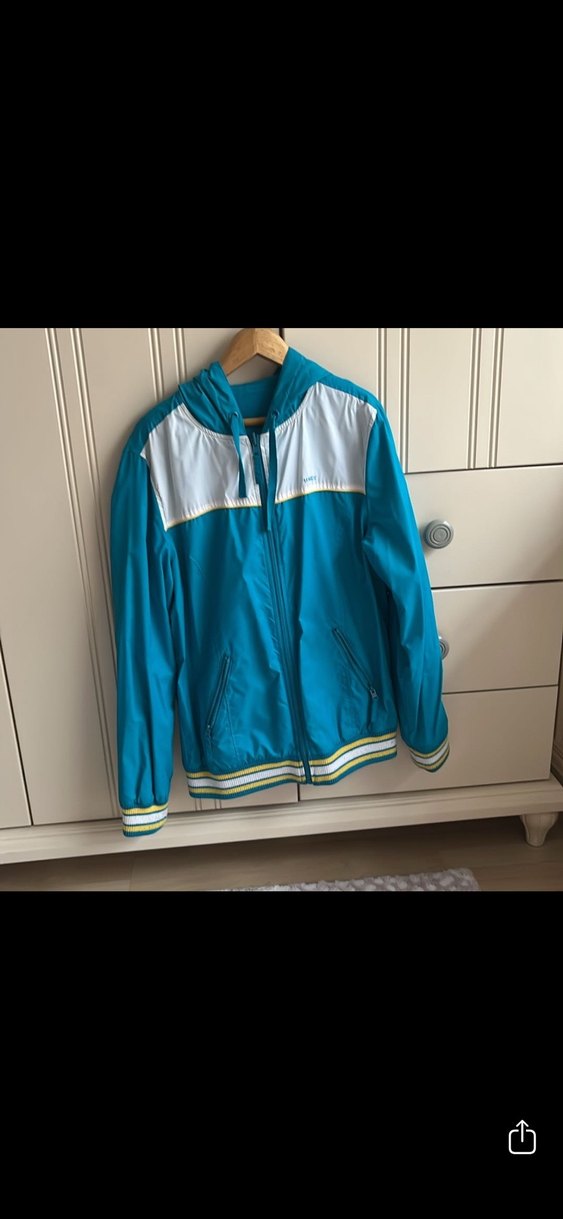 Parlak mavi sentetik kumaştan yapılmış, kapüşonlu ve fermuarlı önü olan, uzun kollu, vücuda oturan midi uzunlukta kadın spor ceketi. Xs beden çift taraflı yağmurluk temiz kullanıldı