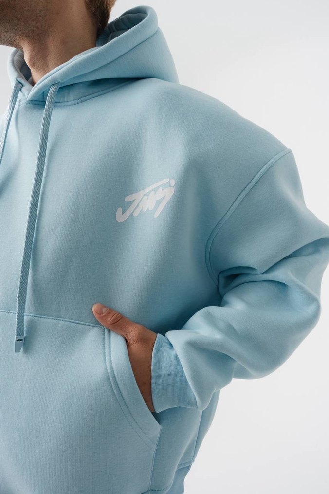 Tüm bedenleri mevcut Pastel mavi, bol kesim, yuvarlak yaka sweatshirt. Yumuşak kumaştan, uzun kollu ve desensiz, günlük kullanım için uygun.