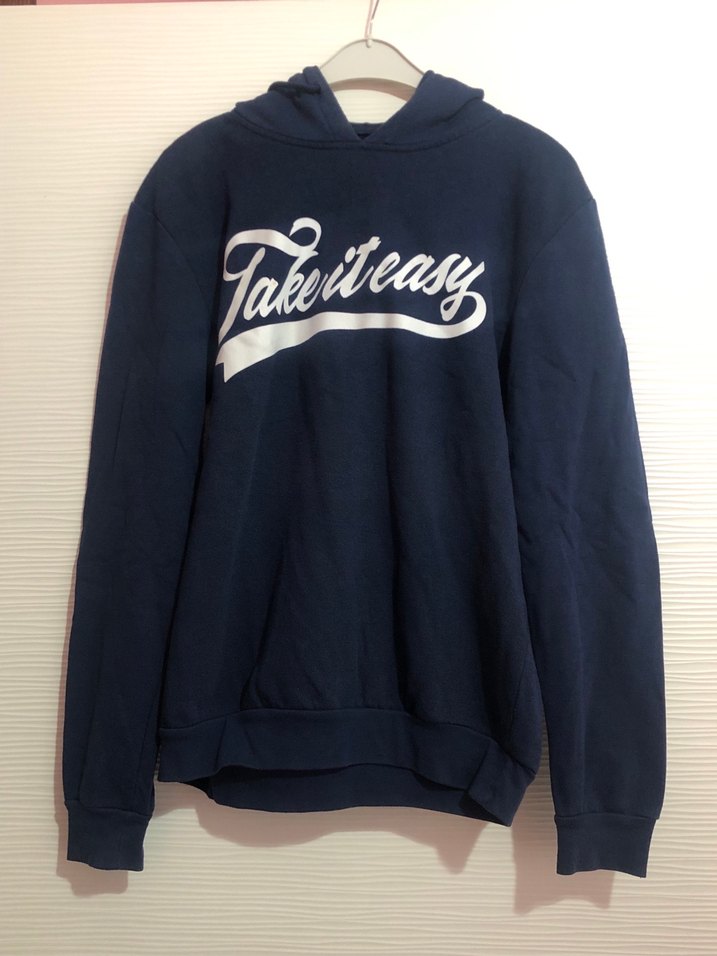 uzun kollu, bol kesim ve bisiklet yakalı sweatshirt. "Take it easy" baskılı, koyu mavi denim kumaştan, Günlük rahat kullanım için uygundur.