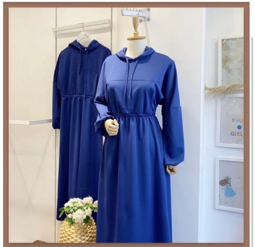 Mavi, kapüşonlu, uzun kollu ve yuvarlak yaka kadın elbisesi. Rahat kesimi ve yumuşak, sıcak kumaşıyla günlük kullanıma uygundur. Ürünün beli lastikli olduğu için 36-40 bedene kadar olur.