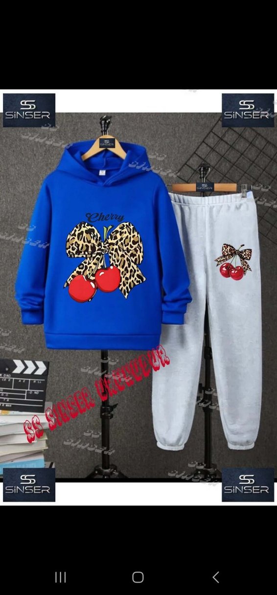 Mavi kapüşonlu sweatshirt ve gri eşofman altı, payetli leopar fiyonk ve kiraz desenleriyle süslenmiştir. Rahat ve bol kesim, casual stil için uygundur.