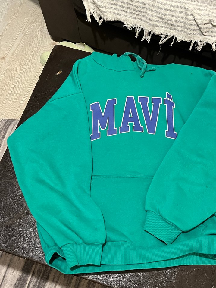 Yeşil kapüşonlu sweatshirt, bol kesim ve uzun kollu. Yumuşak, sıcak kumaştan üretilmiş, önünde "MAVI" baskısı ve fermuarlı detay bulunur. Spor ve günlük kullanıma uygun.orjinaldir