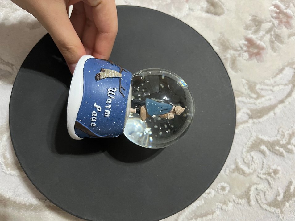 Mavi kar küresi içinde küçük bir figür ve tabanında 'Warm Saue' yazısı bulunan kış temalı süs eşyasıdır. ❄️