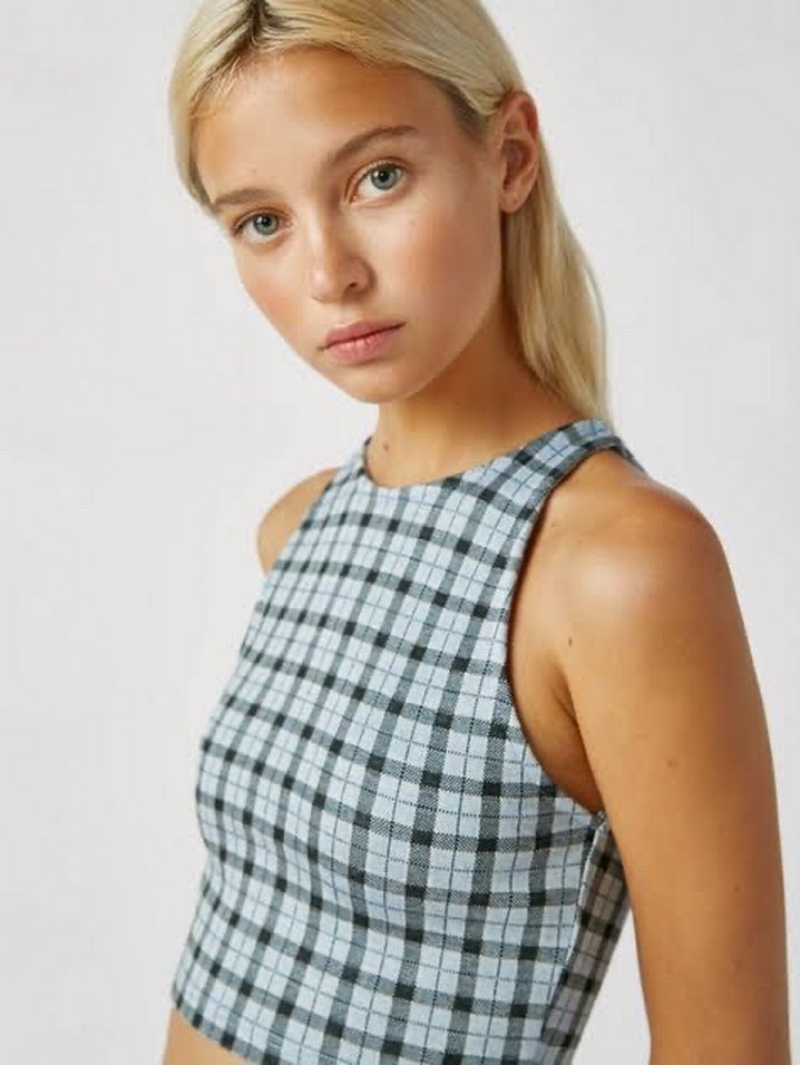 Pull&Bear marka S beden mavi kareli crop top. Herhangi bir deformesi yoktur.
