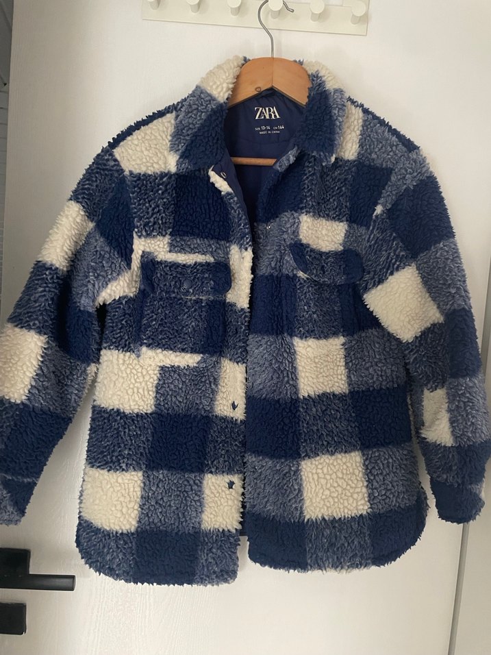 koyu mavi kareli desenli, düğmeli ve yakalı ceket. Yumuşak ve sıcak kumaştan, rahat sokak stili için.