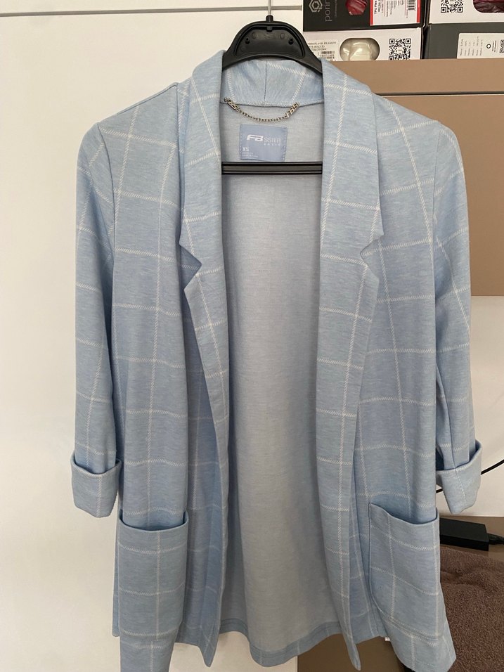 Mavi kareli, düğmeli, keten kumaştan kadın blazer ceket. Normal uzunlukta, uzun kollu ve regular fit, ofis ve sokak stiline uygundur.