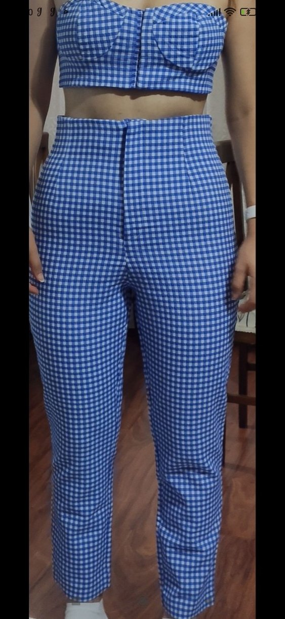 Mavi kareli, düğmeli kadın kumaş pantolon. , ve günlük rahat kullanıma uygun.
