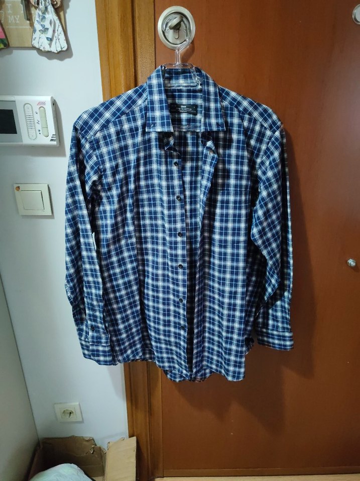 Uzun kollu, düğmeli ve yakalı erkek gömleği. Yumuşak pamuk kumaştan, bol kesim ve koyu mavi kareli desende, günlük rahat kullanım için uygundur.