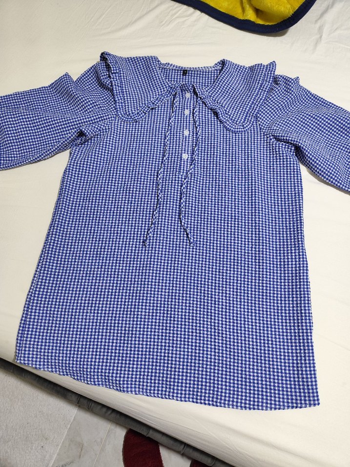 Mavi kareli desenli, fırfırlı yakalı ve kısa kollu, bol kesim kadın gömleği. Parlak sentetik kumaştan, günlük sokak stili için uygun.sadece bir defa giyildi.