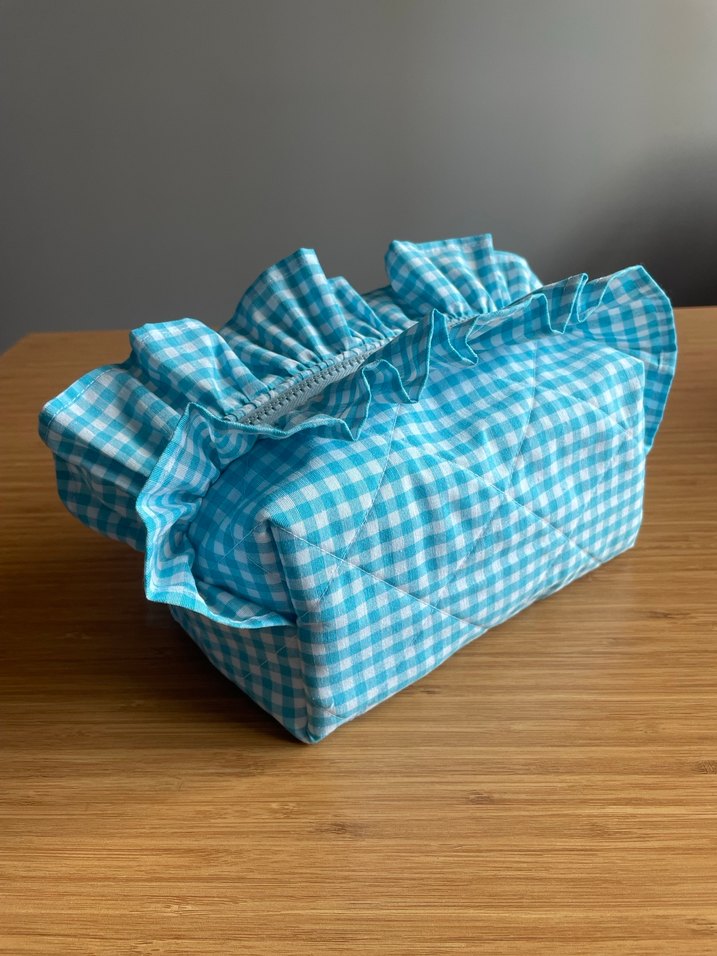 Mavi kareli, poplin kumaştan yapılmış, fırfır detaylı vintage tarzda pastel tonlarda kadın makyaj çantası.