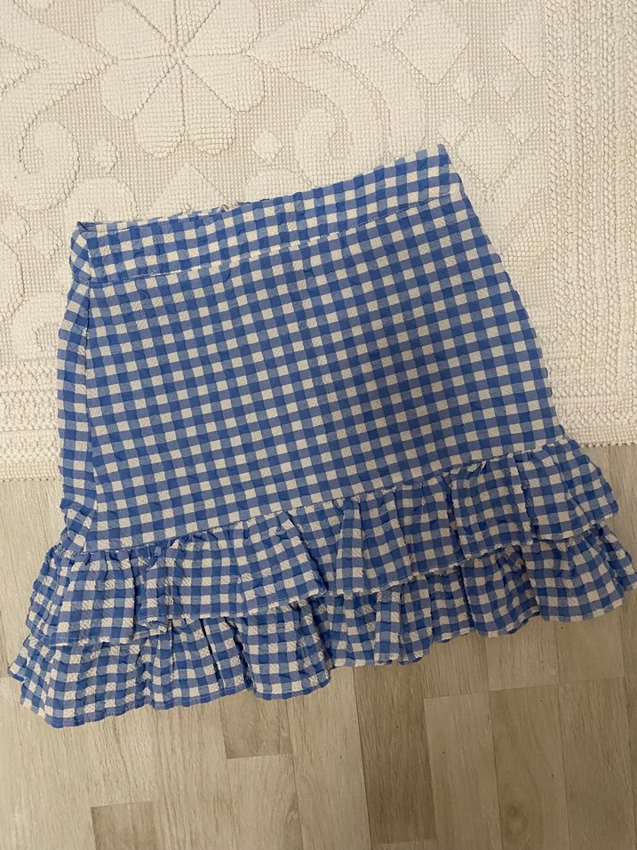 Mavi kareli desenli, pamuklu kumaştan yapılmış, bol kesim midi etek. Fırfır detayıyla bohem tarzını yansıtır. Günlük kullanıma uygundur.
