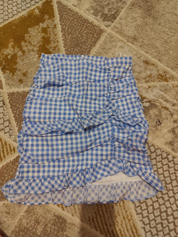 xs ve s bedenibe uygun Mavi kareli, fırfırlı detaylara sahip, yumuşak sentetik kumaştan yapılmış, normal uzunlukta ve vücuda oturan midi mini etek.