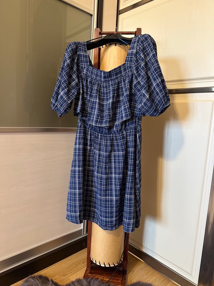 Mavi Kareli Kısa Elbise