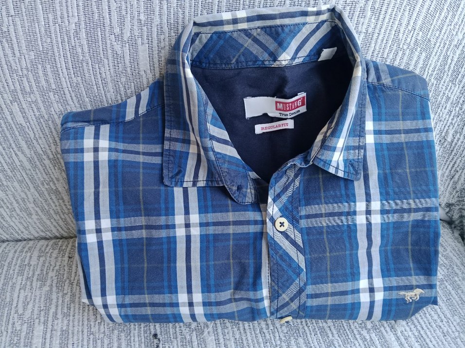 Mavi kareli kısa kollu, düğmeli gömlek. Sentetik kumaştan, regular fit ve notched lapel yaka. Günlük kullanıma uygun, sokak tarzı rahat bir model. "MUSTANG" etiketi bulunur.