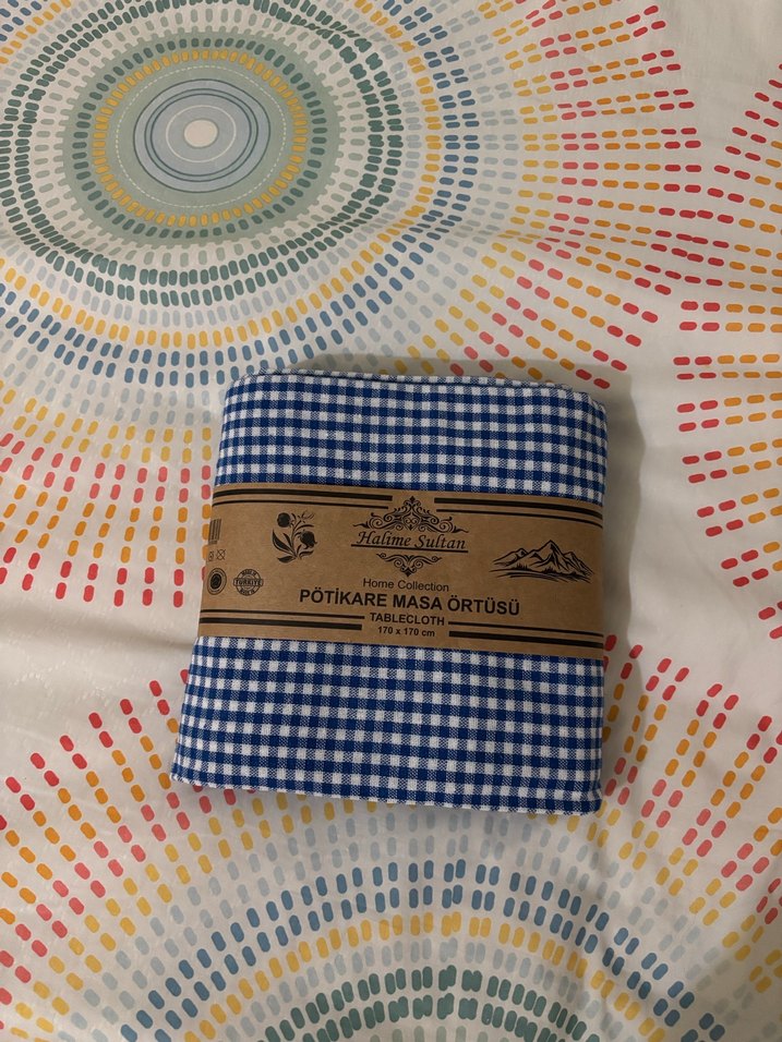 Klasik desenli mavi kareli masa örtüsü, 170x170 cm ölçülerinde. Hiç kullanılmadı