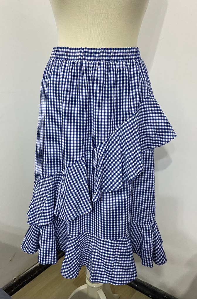 Mavi kareli desenli, volan detaylı ve midi boy rahat kesim eteği. Günlük kullanıma uygun.