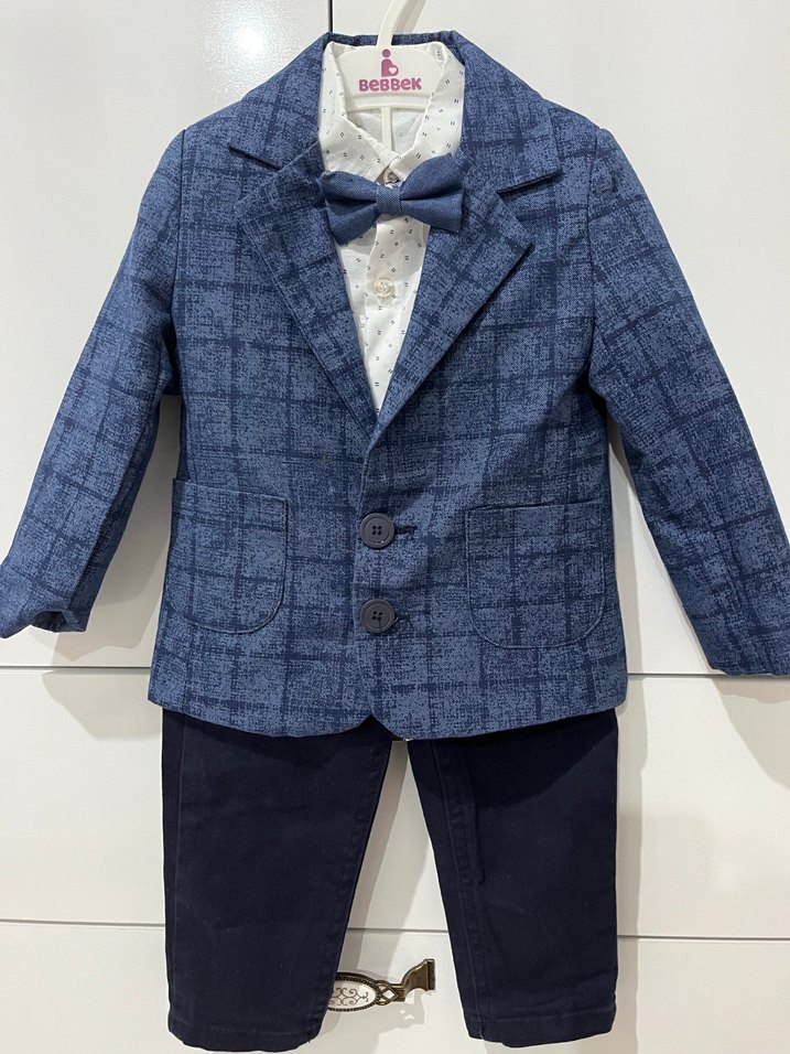 Mavi kareli blazer, düğmeli ön ve klasik yaka ile modern klasik tarzda erkek çocuk takımı. Koyu renk pantolon ve papyonla tamamlanmıştır.