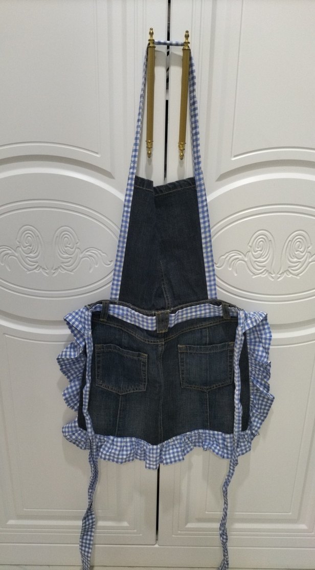 Koyu mavi kot kumaş üzerine mavi kareli ve fırfırlı detaylarla mutfakta şıklık ve fonksiyon sunar. hiç kullanılmadı
