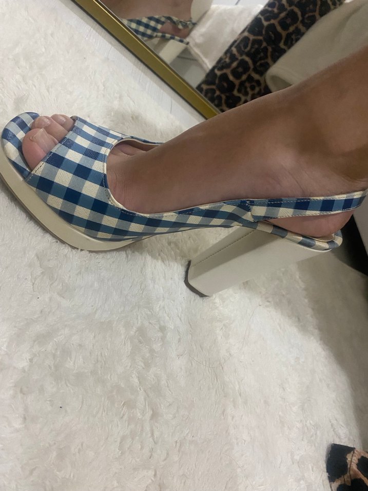 Mavi kareli, tokalı bantlı platform topuklu ayakkabı. Kauçuk malzemeden, trend günlük stil için uygun.