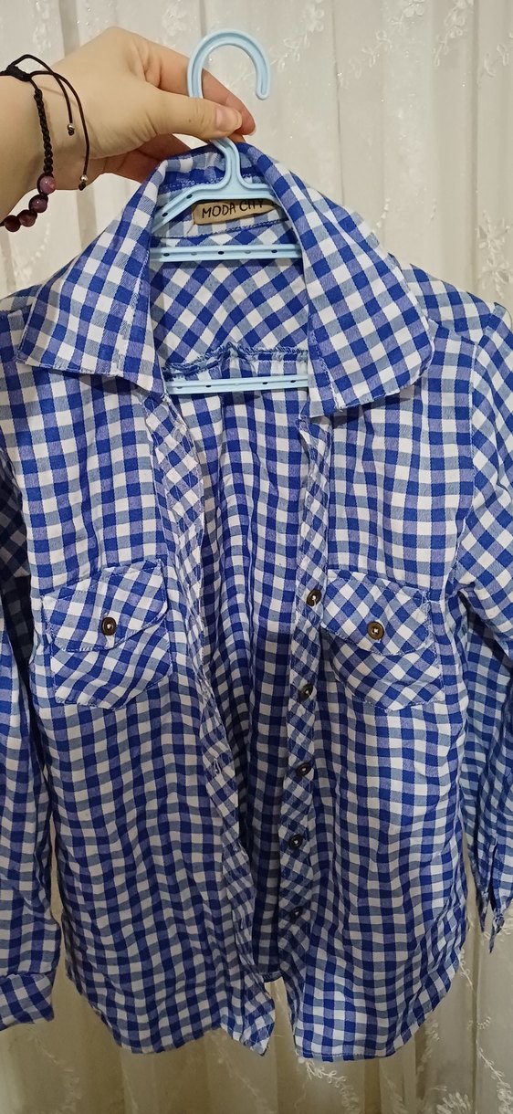 Mavi kareli, uzun kollu ve düğmeli ön kısmı olan pamuklu gömlek. Salaş kesimi ve kesik yaka detayıyla günlük rahat stil için uygundur.