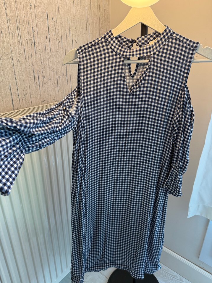 Mavi kareli midi elbise, uzun kollu ve omuzları açık kesimlidir. V yaka, bol ve drapeli tasarıma sahiptir, sentetik kumaştan üretilmiştir.