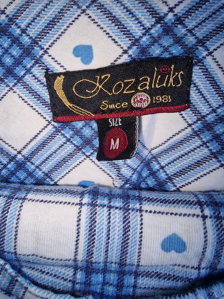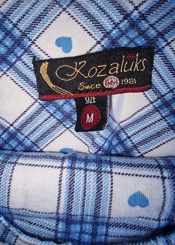 Kozaluks markalı, mavi kareli ve kalp desenli hamile pijama 3 parça. M-L beden, retro ve bohem tarzını yansıtır.