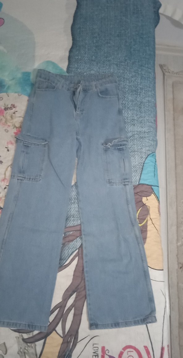 Bağcıklı detaylı, gri-mavi tonlarında, salaş kesim ve uzun boy kot pantolon. Günlük, trend sokak stili için uygundur.