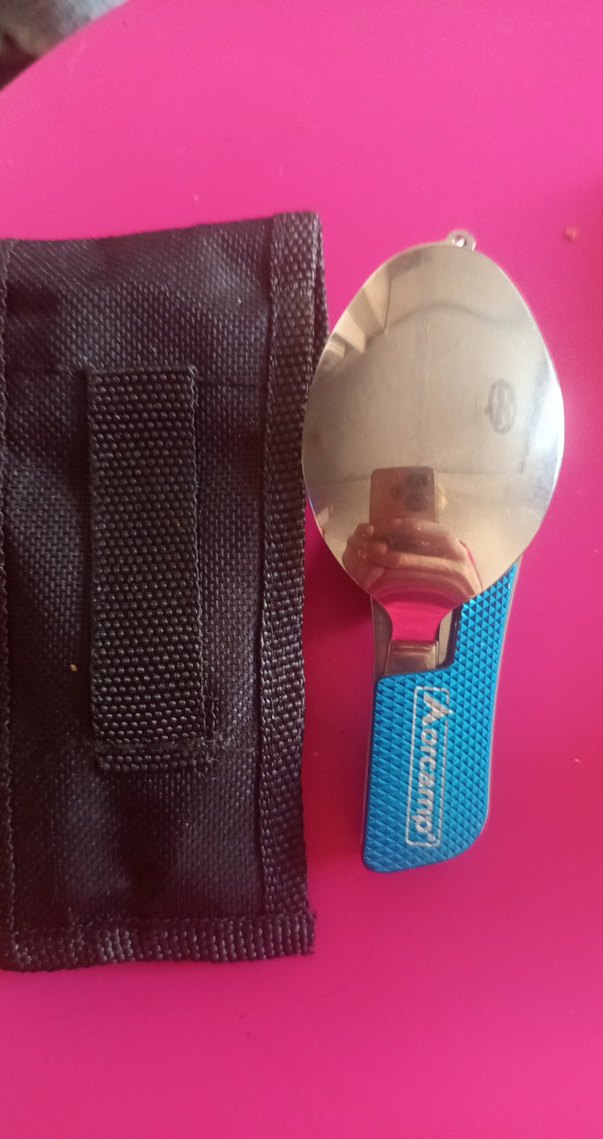 Koyu mavi katlanabilir kaşık, paslanmaz çelik başlık ve dokulu sap içerir. Siyah kumaş kılıf ile birlikte gelir.