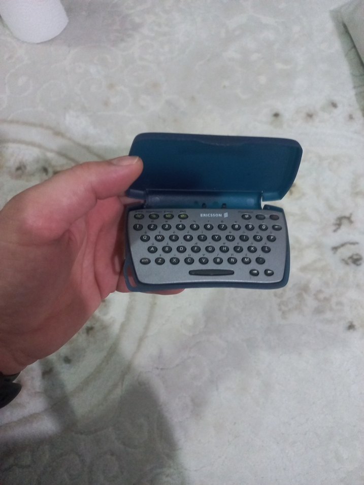 Bu kompakt Ericsson klavye, katlanabilir tasarıma sahip, gri tuşlu ve canlı mavi kaplamalıdır. Taşınması kolaydır. ⌨️