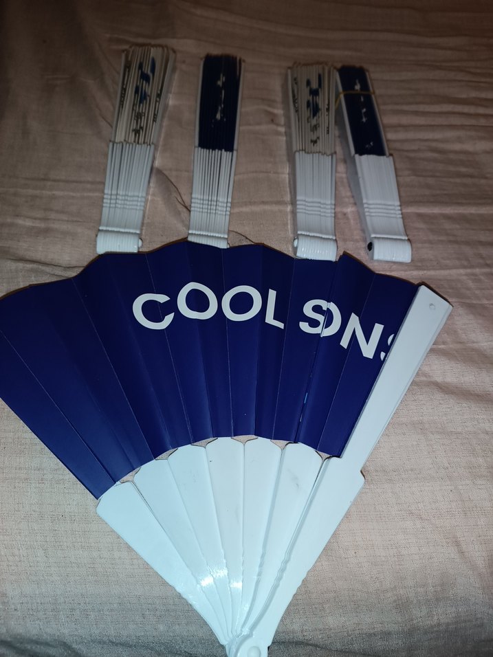 Beyaz saplı, koyu mavi kumaş üzerine beyaz yazılı mavi katlanabilir yelpazeler. Serinletici esinti sağlar.