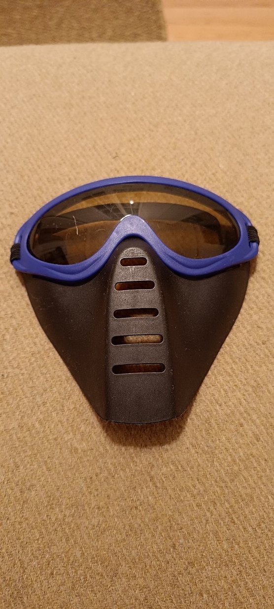 Koyu mavi plastik yüz maskesi ve kayak gözlüğü, havalandırma delikleri ve cırt cırtlı bant ile güvenli kullanım sağlar. Desensiz, grunge punk tarzına uygun.
