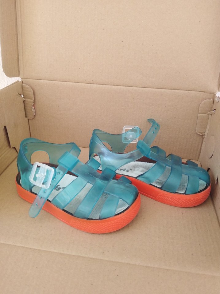 Mavi kayışlı, turuncu tabanlı kauçuk erkek çocuk sandalet. Canlı renkleriyle dikkat çeker. #erkekçocuk #yazlıkayakkabı #sandalet