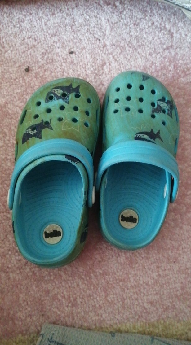 Mavi renkli, kayışlı ve köpekbalığı desenli kauçuk erkek çocuk terliği. Retro ve bohem tarzı yansıtıyor.