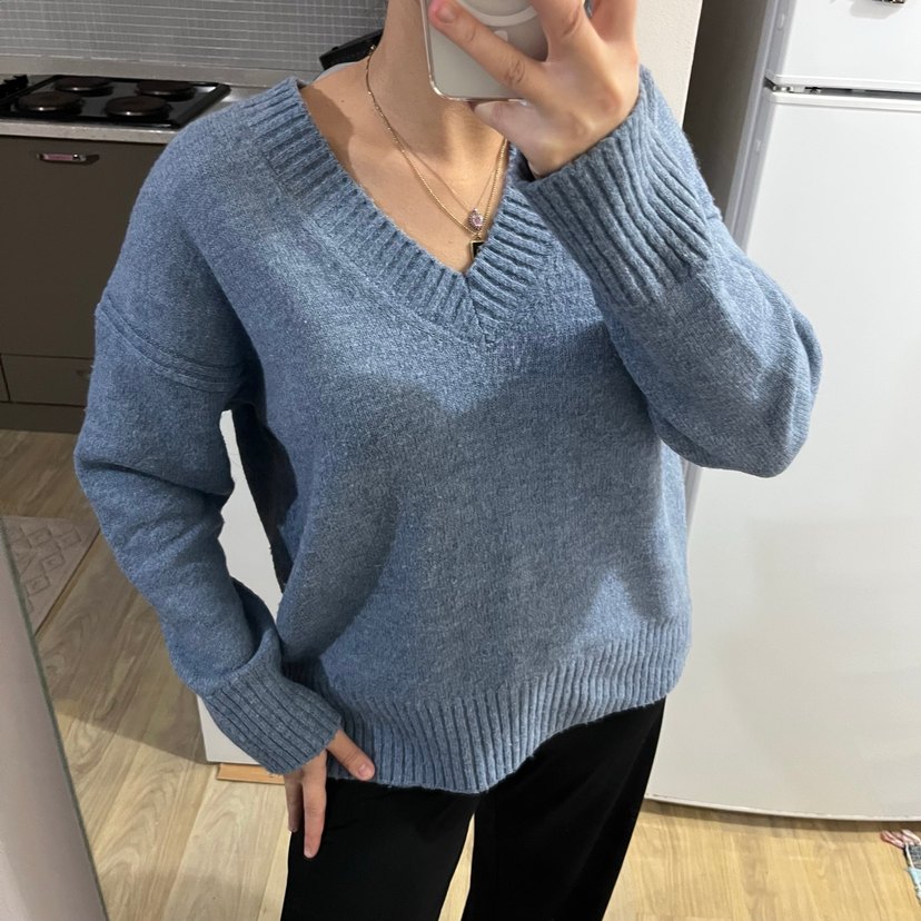 Kızlarrr maviden almıstım. Çok severek kullandım. Herhangi bir sorunu yok. Işıktan dolayı tüylenmiş gibi duruyor. Rengi mavinin en güzel tonu. Boyu biraz uzun ve benzerleri var diye satıyorum. Etiketi kaşındırıyor diye kesmiştim ama m diye hatırlıyorum bedenini. Oversize bir kazak.