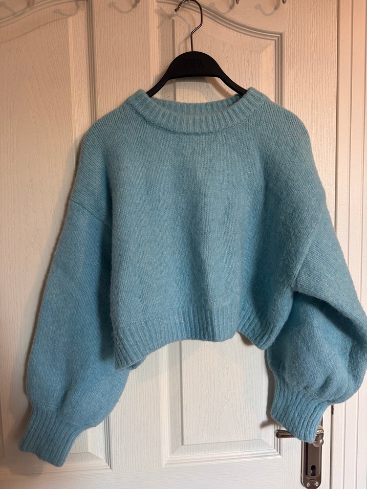 Zara, mavi yünlü kazak, bisiklet yaka ve uzun kolludur. Yumuşak örgü kumaştan yapılmış, normal boyda ve günlük kullanıma uygundur. Hiçbir kusur ve deformesi yok mağazadan alındığı haliyle duruyor.