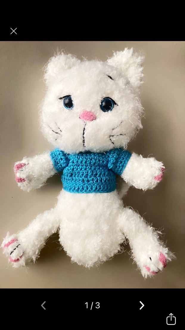 Mavi örgü kazak giymiş, pastel renklerde yumuşak beyaz peluş kedi oyuncak.