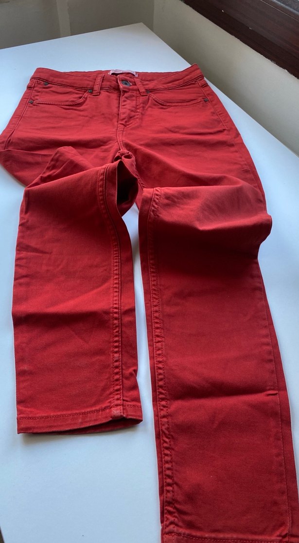 kırmızı renkli, sentetik kumaştan yapılmış, normal boy kesim ve dar kalıp kadın kumaş pantolon. Rahat ve sade normcore tarzda günlük kullanıma uygun.
