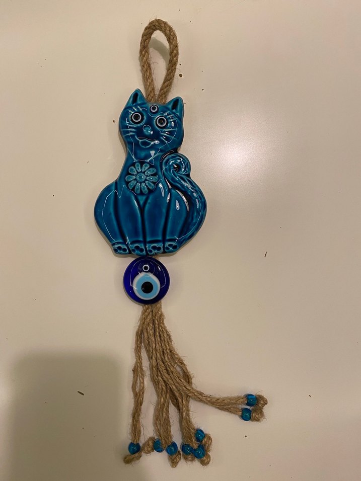 Seramikten yapılmış koyu mavi kedi figürlü, nazar boncuklu ve doğal ip püsküllü duvar süsü.