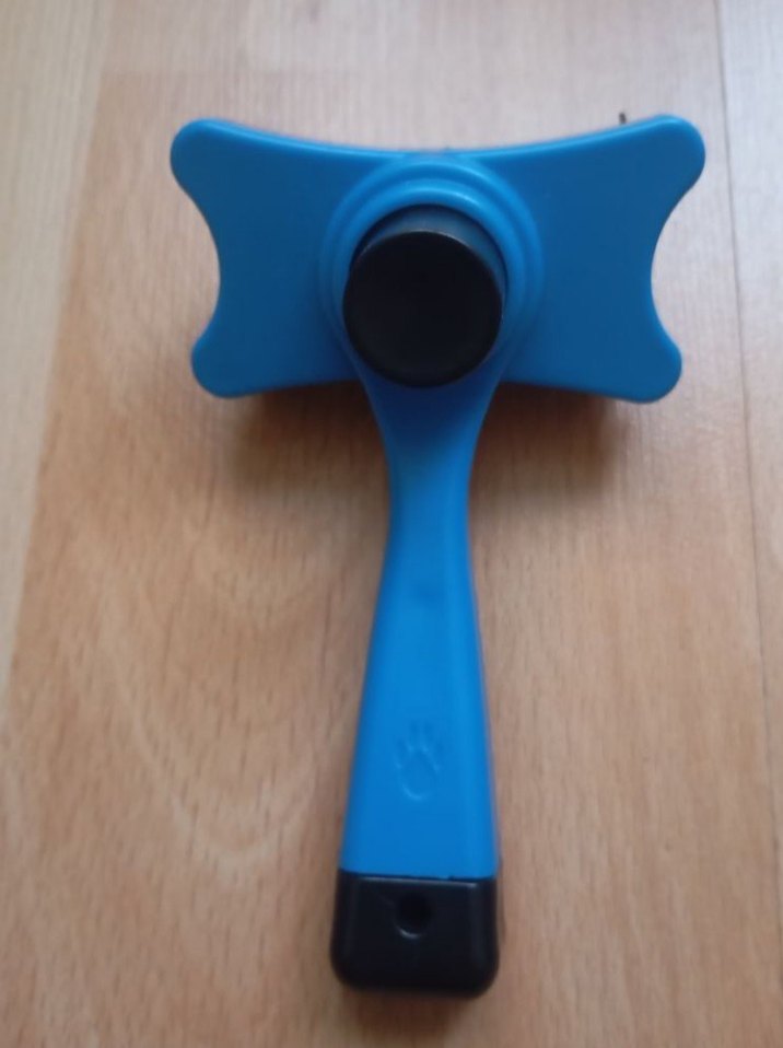 Mavi renkte, rahat saplı kedi tüy toplama fırçası. Yumuşak kıllarıyla tüyleri etkili şekilde temizler.