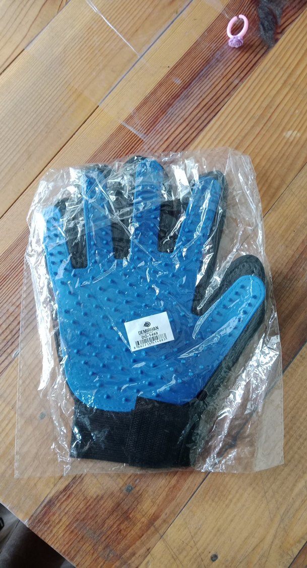 Mavi renkli, yumuşak kauçuk uçlu kedi tüyü temizleme eldiveni. Ayarlanabilir bantla rahat kullanım sağlar.