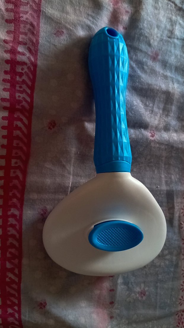 Mavi renkli, kolay tutuşlu saplı kedi tüyü toplayıcı fırça.